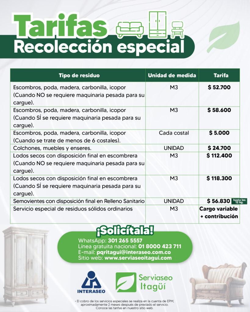 SERVIASEO ITAGÜÍ S.A.S. E.S.P En cumplimiento de las Resoluciones CRA 151 de 2001, y CRA 403 de 2006, compiladas en la Res. CRA 943 de 2021, se permite informar a los usuarios del municipio de Itagüí, Antioquia los costos de referencia, porcentajes de subsidios y aportes y las tarifas vigentes para el servicio público domiciliario de aseo, calculadas con la metodología tarifaria CRA 720 de 2015.